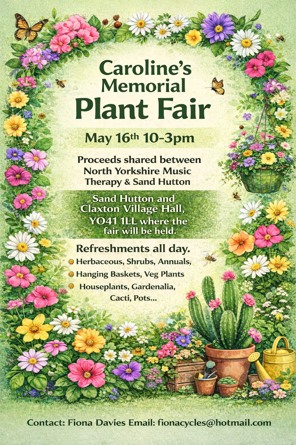 In recognition of the late Caroline Hall’s massive contribution to our community over many years, a Plant Fair in Caroline’s memory is being held in Sand Hutton and Claxton Village Hall on Saturday 16 May 2026 commencing at 10.00am. Organised by the Village Hall Committee, the event proceeds will be divided equally between the Village Hall and North Yorkshire Music Therapy which Caroline was very involved with. If you want to bring some plants and / or bake a cake please let Fiona Davies know – fionacycles@hotmail.com